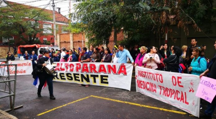 El gremio de Enfermería, en movilización frente al Ministerio de Salud Pública y Bienestar Social (MSPYBS) solicitaron aumento salarial, informó Mirian Alderete, representante de las trabajadoras de salud.