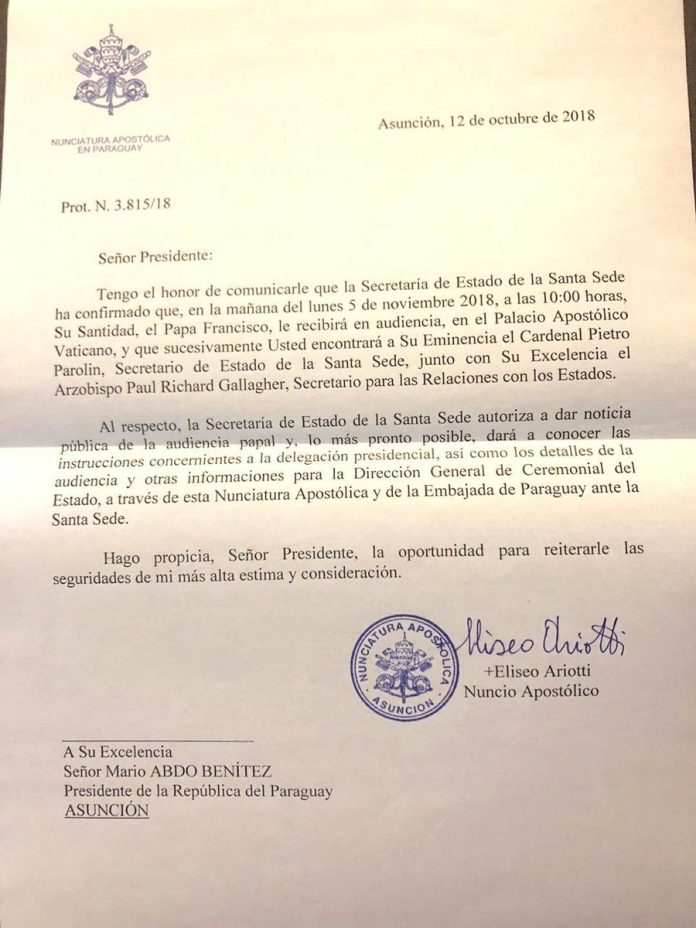 El jefe de Estado explicó que la audiencia con el Santo Padre en el Vaticano, forma parte de la gira que realizará en Italia a inicios de noviembre próximo.