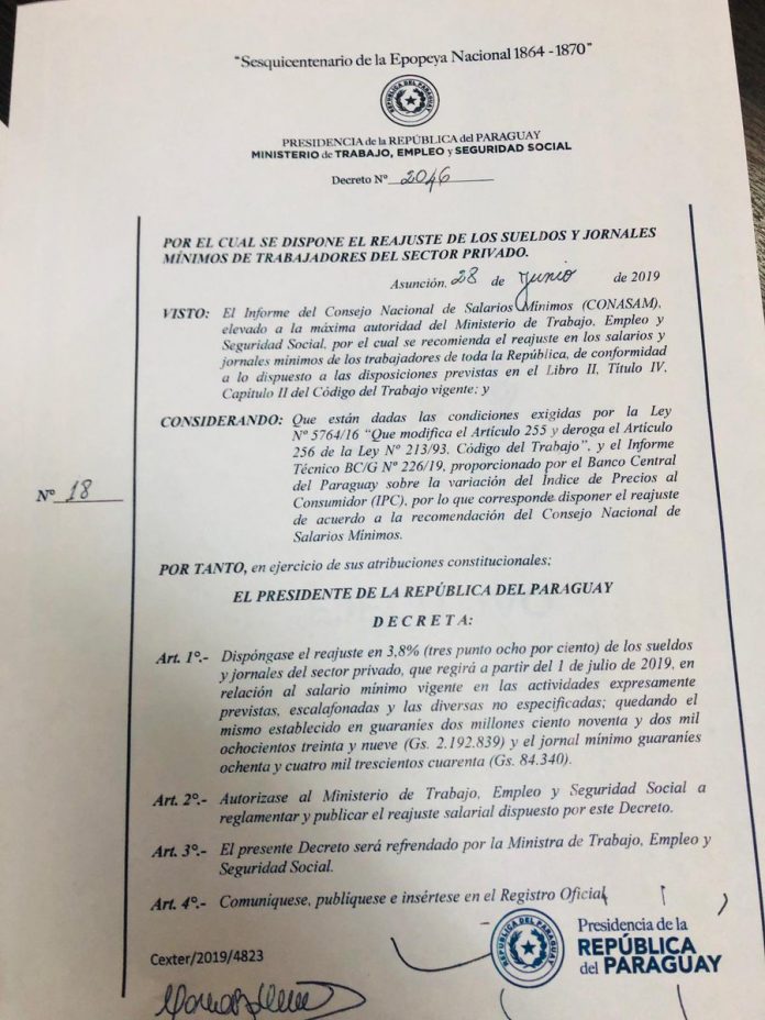 Sin categoría Ejecutivo decreta reajuste en salario mínimo 01/07/2019 779 El Poder Ejecutivo emitió este lunes el decreto por el cual se establece un reajuste del 3,8% al salario mínimo legal vigente. A partir de este julio, el salario mínimo asciende a los Gs. 2.192.839 y el jornal mínimo diario de Gs. 84.340.