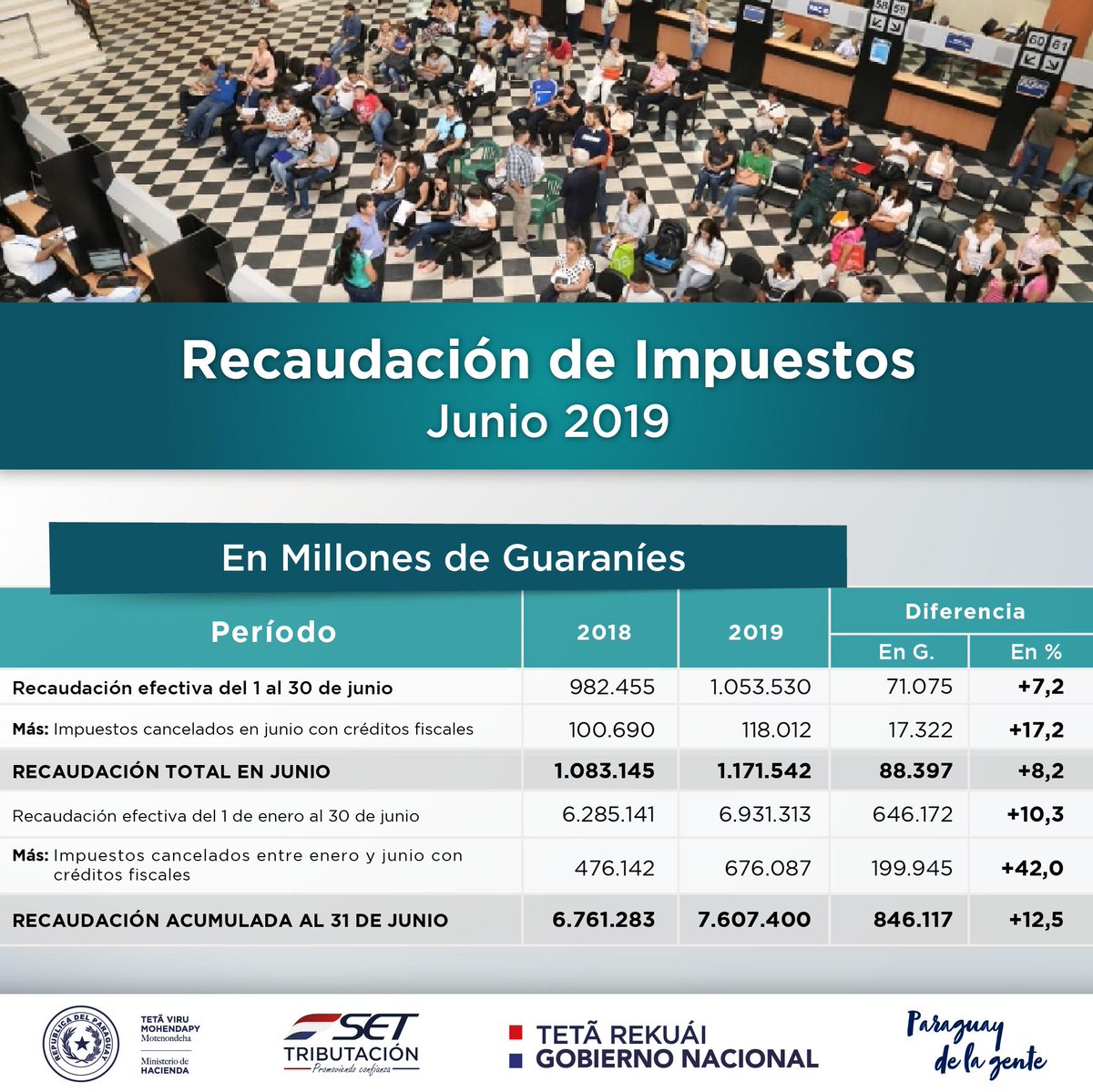 Menciona que en el mes de junio de 2019, la SET registró una recaudación de G. 1,17 billones (USD 188 millones, al tipo de cambio de 6.234 G/USD), con un incremento del 8,2 por ciento. De este valor, lo cobrado en dinero alcanzó la suma de G. 1,05 billones, mientras que la diferencia corresponde a cobros de impuestos cancelados con créditos fiscales.