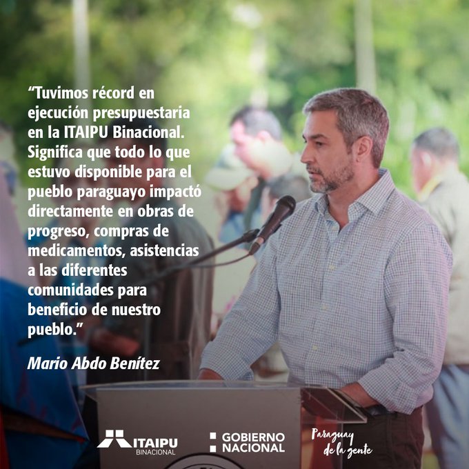 El presidente de la República, Mario Abdo Benítez, recordó durante el discurso en la jornada de Gobierno en Alto Paraná, que en la actualidad, nuestro país, dispone del 100 por ciento de su energía proveniente de la hidroeléctrica compartida con Argentina a través de la línea de los 500 KV.