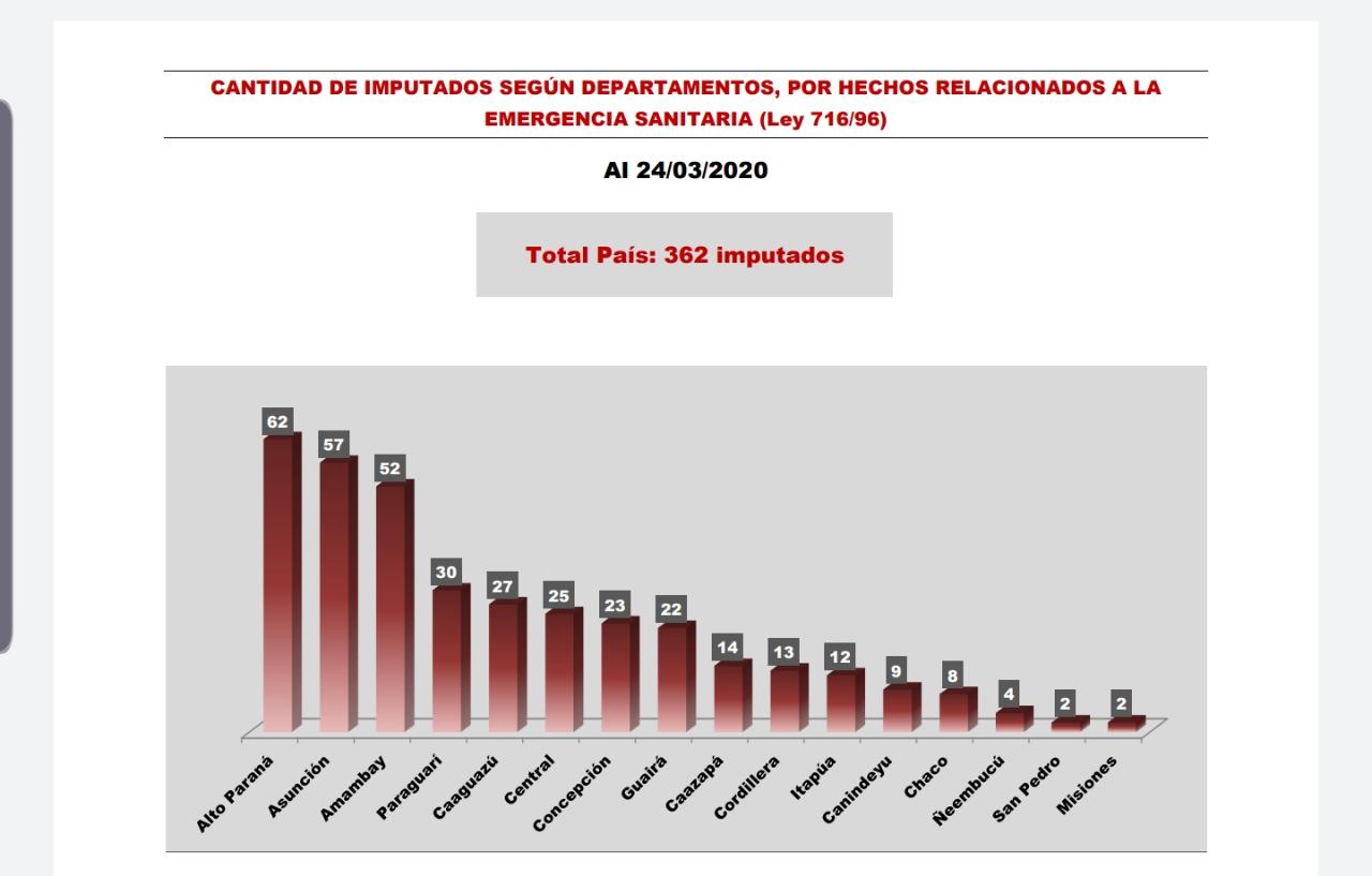 Afirma que en el marco de los procedimientos realizados por los diversos agentes fiscales en todos los departamentos a nivel nacional, se registran un total de 362 imputaciones desde la aplicación de las medidas restrictivas hasta la fecha.