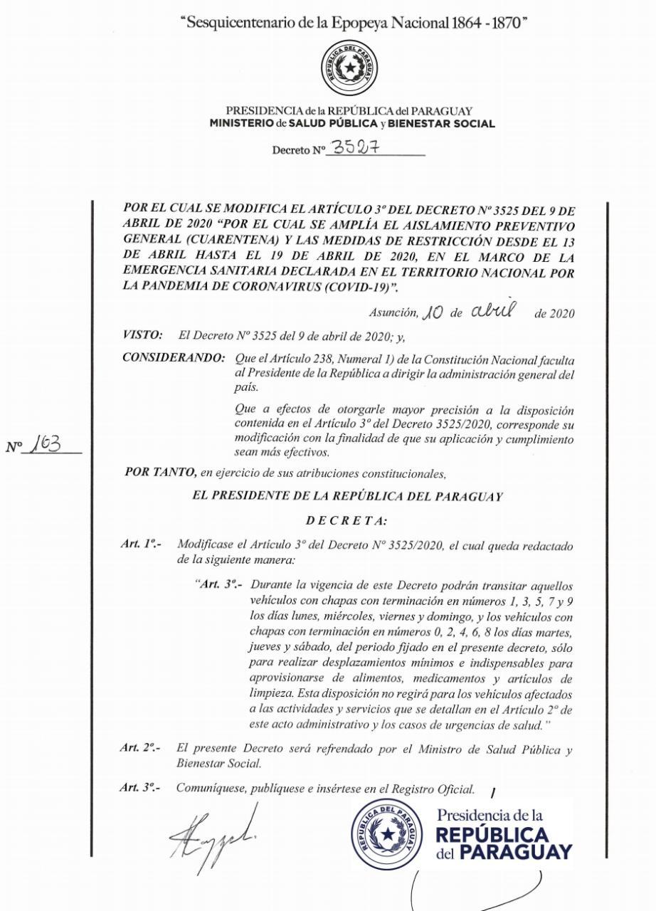Asunción 920 AM El presidente de la República aclara Decreto emitido ayer sobre circulación vehícular 10/04/2020 646 El Presidente de la República emitió un nuevo decreto que aclara lo emitido ayer sobre circulación de vehículo por la pandemia generada por Covid 19.