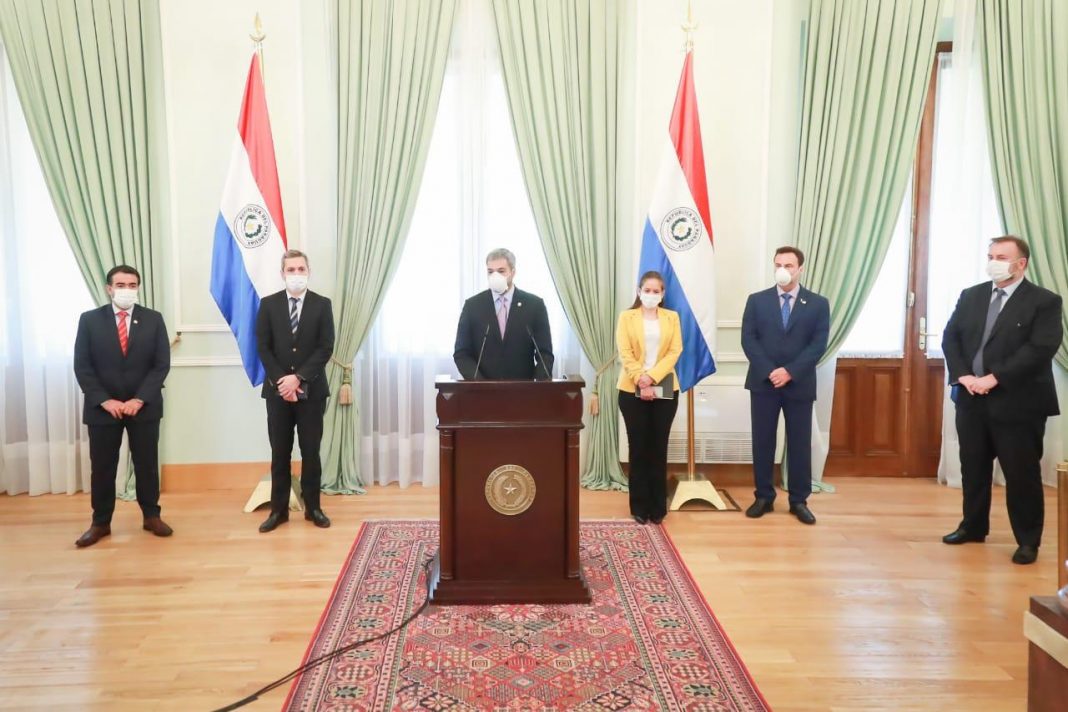 El presidente de la República, Mario Abdo Benítez, estuvo acompañado en la conferencia de prensa, desarrollado en Palacio de Gobierno, por el ministro de Hacienda, Benigno López.