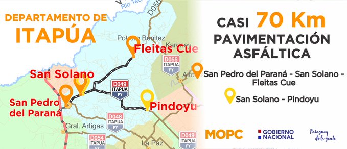 Gracias a estas obras que en total suman 65,82 km, los pobladores de la zona tendrán una conexión pavimentada con la Ruta PY08, beneficiando directamente a comunidades como San Pedro del Paraná, San Solano, Caraguatay, San Vicente, Colonias Unidas, Mburucuyá, Cruce Yavevyry, San Agustín y Fleitas Cue.