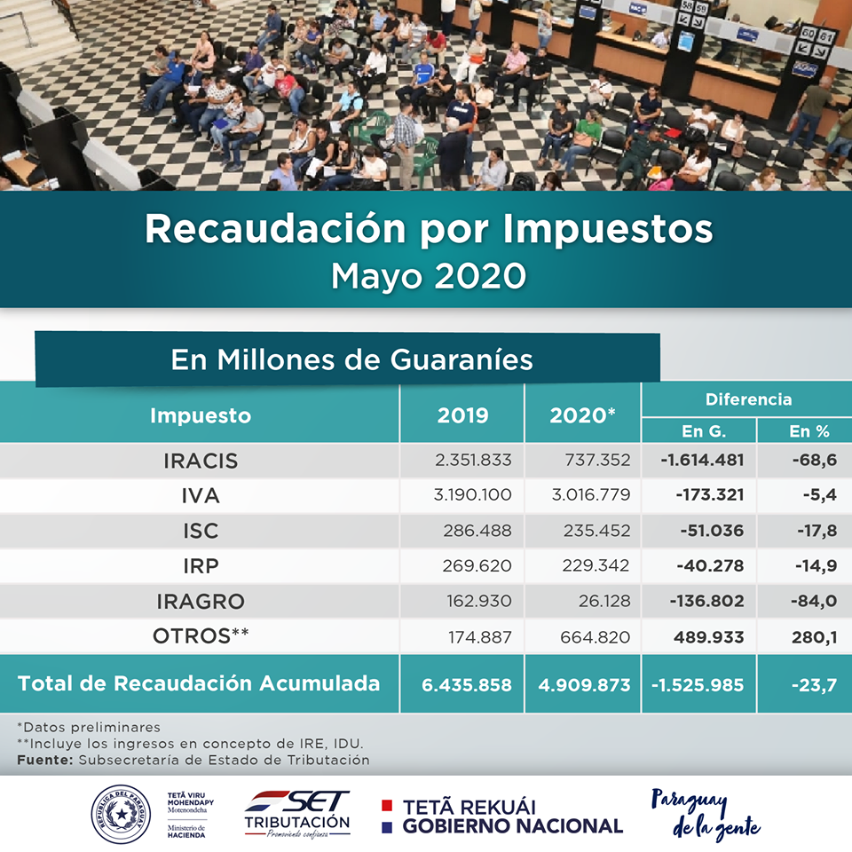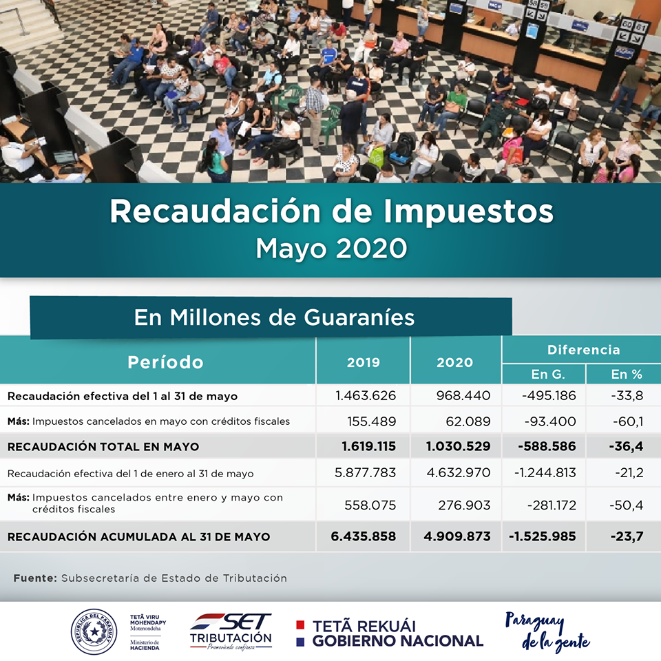 Considerando la disminución de la actividad económica y tomando en cuenta las medidas adoptadas por el Gobierno Nacional con relación a la implementación de la Cuarentena Inteligente, la Subsecretaría de Estado de Tributación (SET) en mayo recaudó G. 968.440 millones (USD 147 millones, al tipo de cambio de G. 6.590/dólar) en efectivo y G. 62.089 millones (USD 9 millones) en compensaciones con créditos fiscales, alcanzando la suma de G. 1.030.529 millones (USD 156 millones).