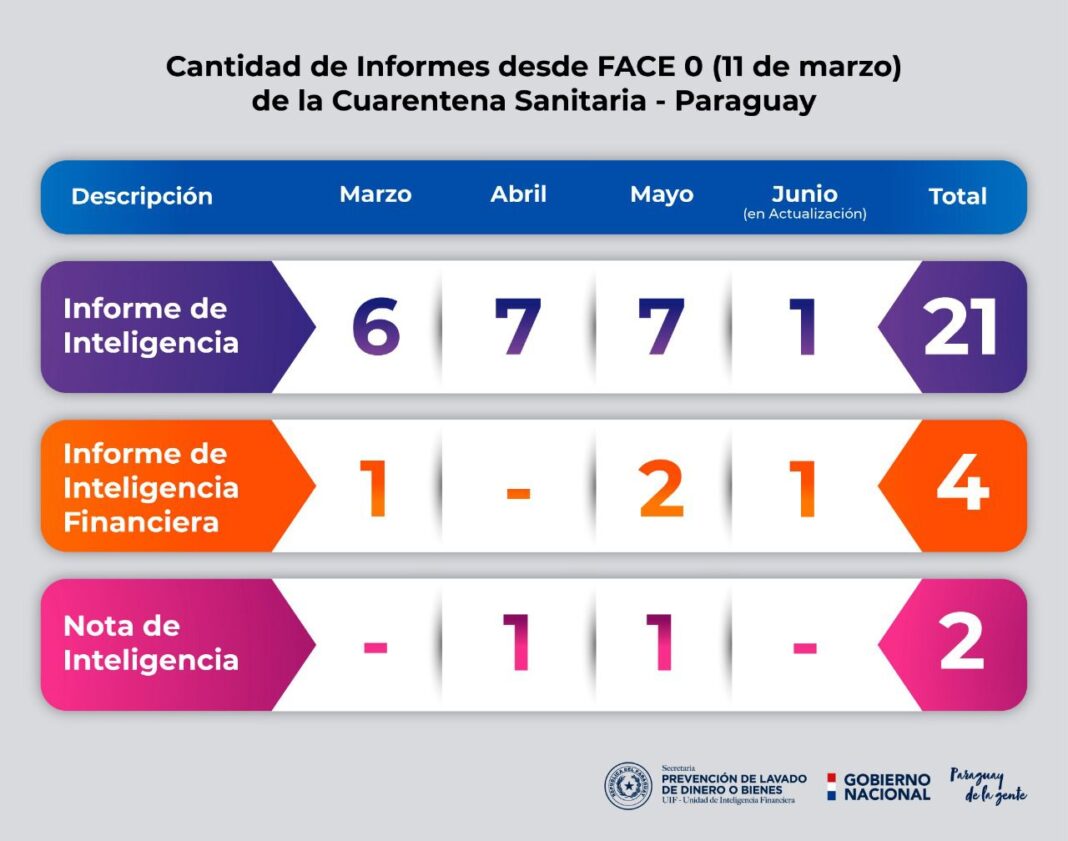 El ministro de la Secretaría de Prevención de Lavado de Dinero, Carlos Arregui en diálogo con Radio Nacional del Paraguay, afirmó que en todos los países de la región de la región durante la pandemia se reportaron casos de operaciones sospechosas y en Paraguay desde marzo hasta junio se registraron 2284, no todas son por lavado de activos, de acuerdo al software inteligente el 1 %, representa un riesgo alto en cuanto a eso, que se clasifica en riesgo alto y bajo, el alto fue plasmado en un informe de inteligencia, que llevaron al Ministerio Público.