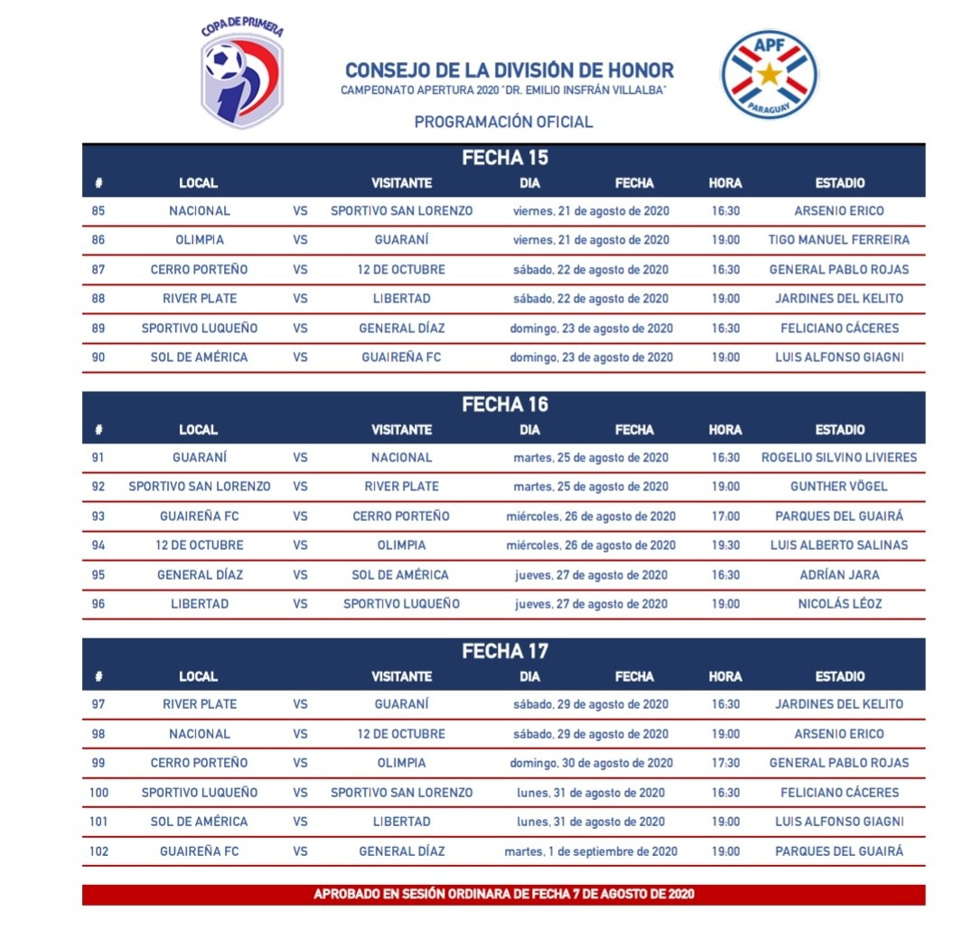 Las jornadas quince, diez y seis y diez y siete, del torneo Apertura, fueron programadas este viernes por el Consejo de la División de Honor de la Asociación Paraguaya de Fútbol (APF), en la reunión realizada en la sede central.