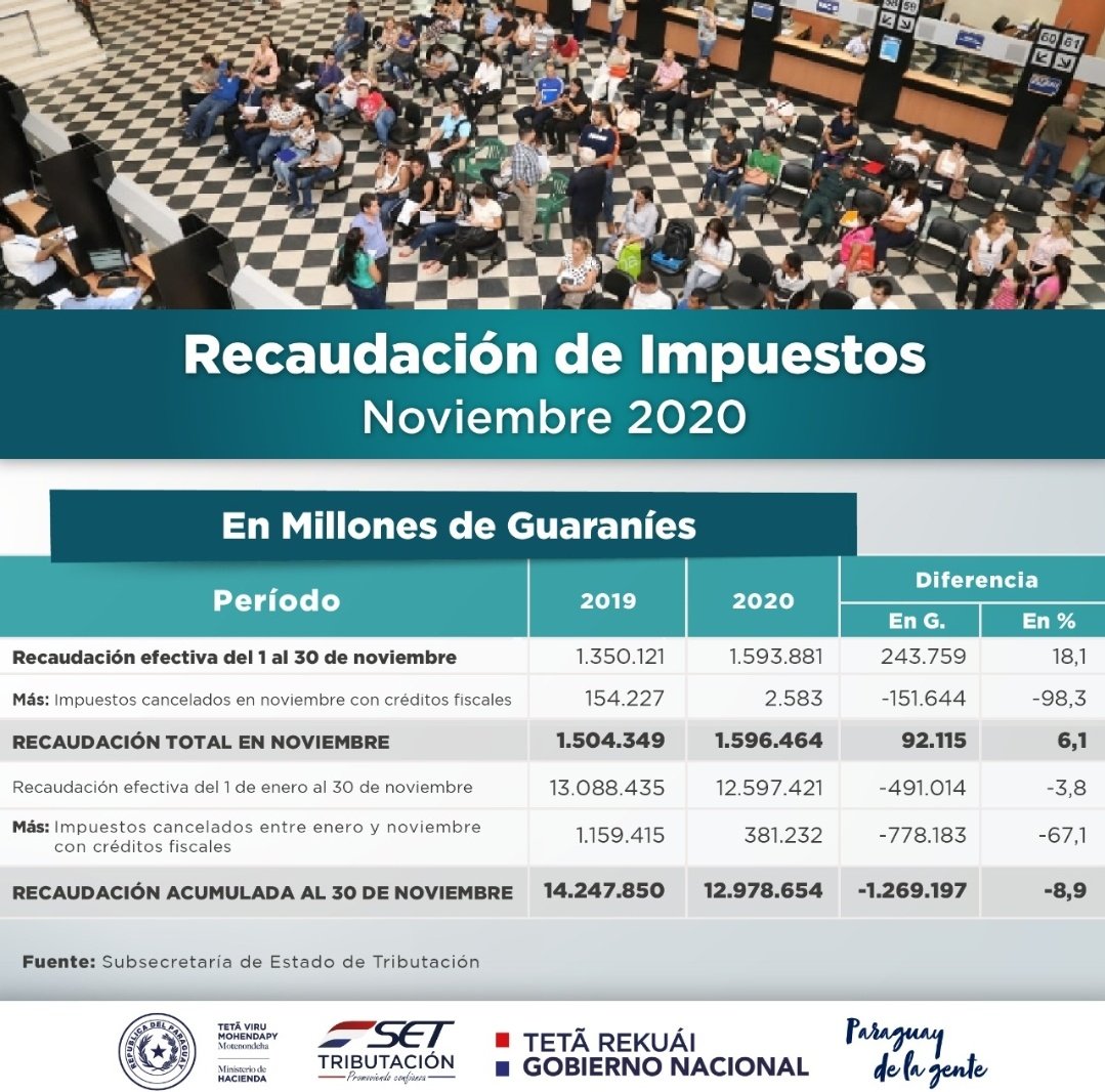 La recaudación en materia de consumo registró un aumento del 11% en noviembre, comparando con el mismo mes del 2019 de esta manera, registró un incremento interanual de 18,1% en los ingresos efectivos, siendo noviembre el segundo mes del año con mayor recaudación, lo cual es muy auspicioso.
