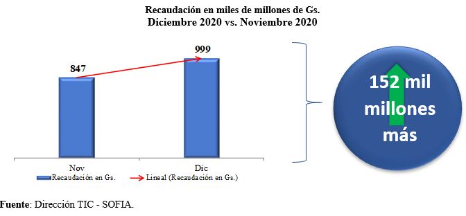 Resaltó que este superávit es superior a  los Gs. 152.000 millones. Además destacó al mandatario paraguayo, que lo recaudado en diciembre, representó el mejor ingreso del año 2020, desde el inicio de la pandemia del coronavirus.
