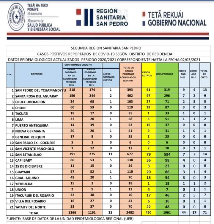 Manifestó que los distritos de San Pedro de Ycuamandyyú, Santa Rosa del Aguaray, San Estanislao, Capiibary, Choré y Liberación, son las ciudades más afectadas, ya que cuentan con mayor densidad poblacional y que esta situación se debe además al relajamiento por parte de la ciudadanía sampedrana, lo cual se refleja en el aumento considerable de los casos positivos de los municipios.