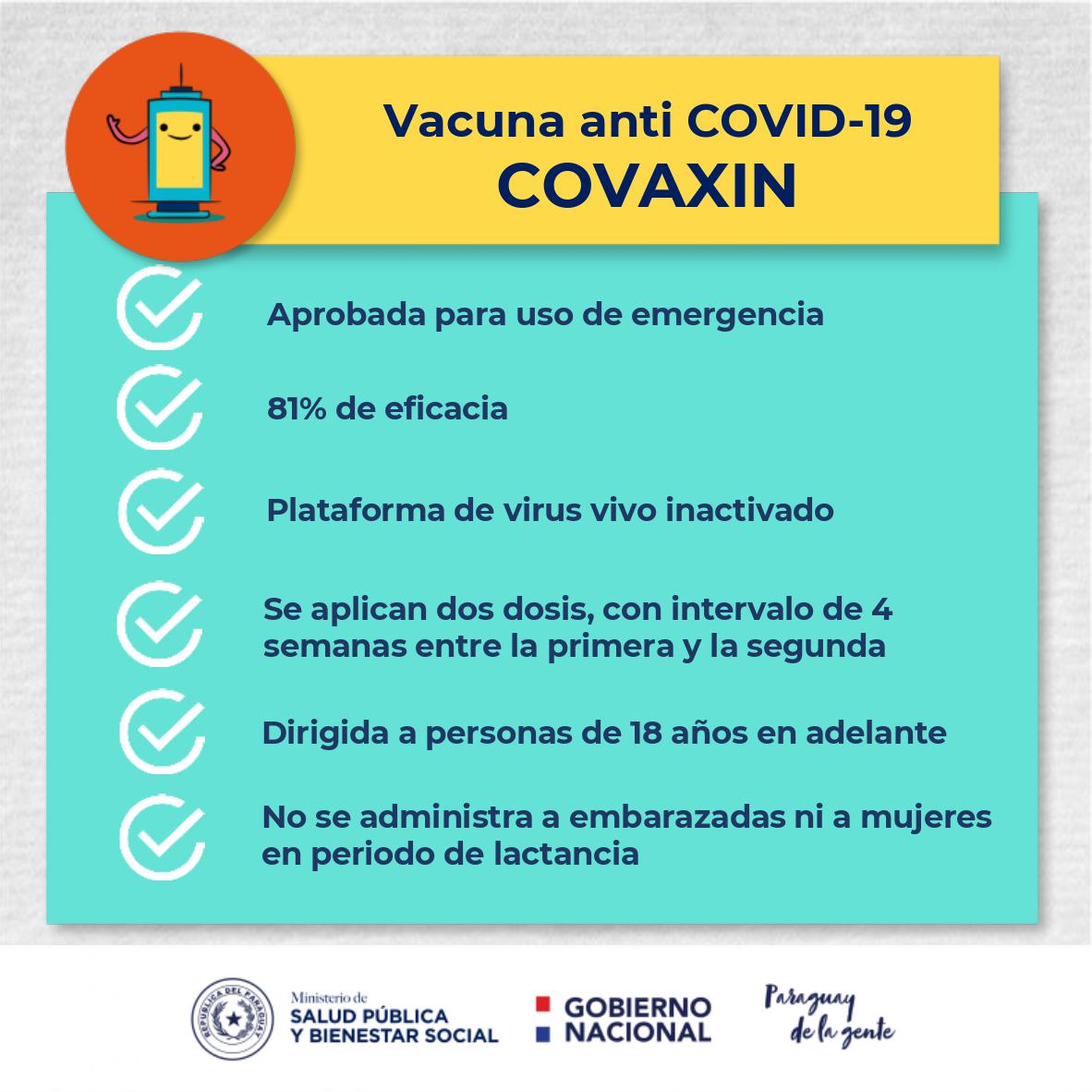 La vacuna Covaxin, es de una plataforma de virus vivo inactivado, explica en las redes sociales el Ministerio de Salud Pública y Bienestar Social (MSPYBS).