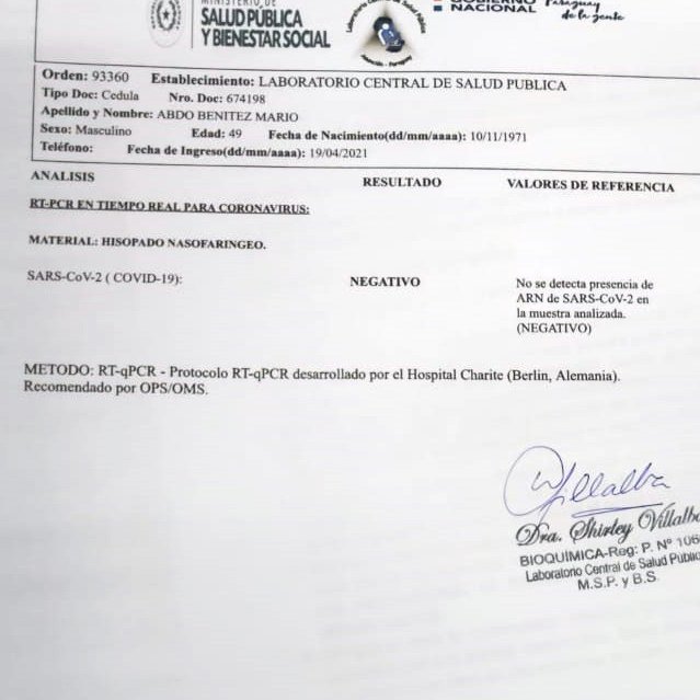 El Ministerio de Salud Pública y Bienestar Social (MSPYBS), a través de la cuenta de twitter informó que el presidente de la República, Mario Abdo Benítez, ha tenido un resultado negativo a la prueba de Sars-Cov-2 (COVID-19), por método de PCR.