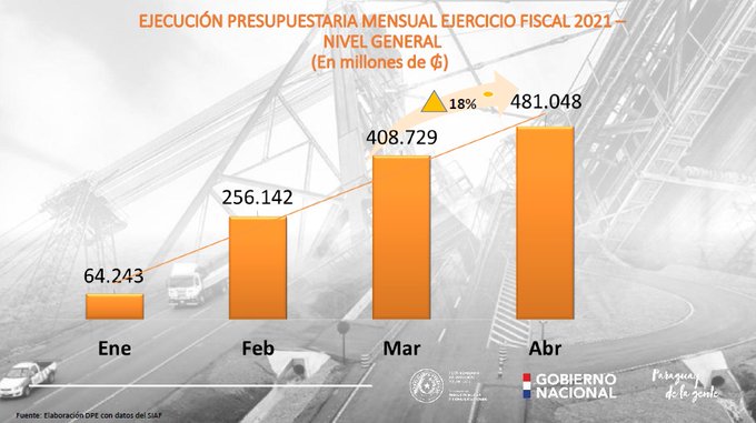 En el portal de noticias de la institución, destaca que a nivel general, el total desembolsado fue de G. 481.048 millones contra G. 408.729 millones alcanzados en marzo, cifra que a su vez representa la ejecución más alta en lo que va del 2021.
