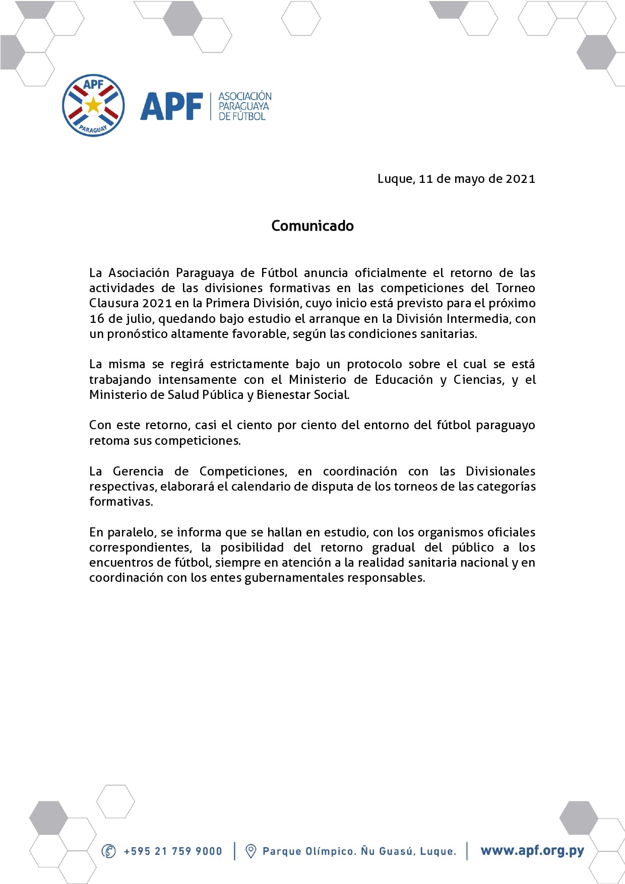 En el comunicado refiere que se disputarán los encuentros bajo la supervisión del Ministerio de Salud Pública y Bienestar Social(MSPYBS) y los cuidados sanitarios para evitar propagación del coronavirus.