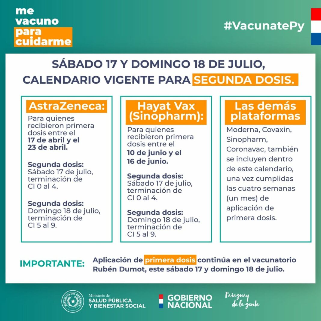 El Ministerio de Salud Pública y Bienestar Social, anunció que este sábado y el domingo, aplicarán la segunda dosis de las vacunas contra COVID-19 de diversas plataformas y que, las personas deben asistir al mismo vacunatorio donde recibieron la primera para completar el esquema de inmunidad.  Actualmente, hay más de un millón de personas inoculadas a nivel país.