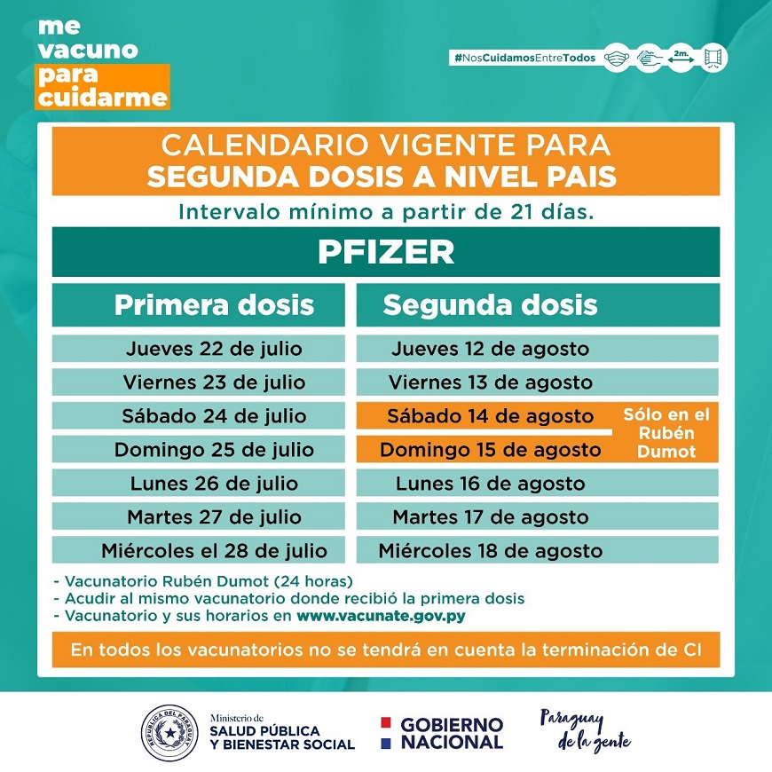 La aplicación de segunda dosis de Pfizer continúa hoy, jueves 12, hasta el miércoles 18 de agosto, sin tener en cuenta terminación de cédula de identidad, una vez cumplido el intervalo de 21 días.