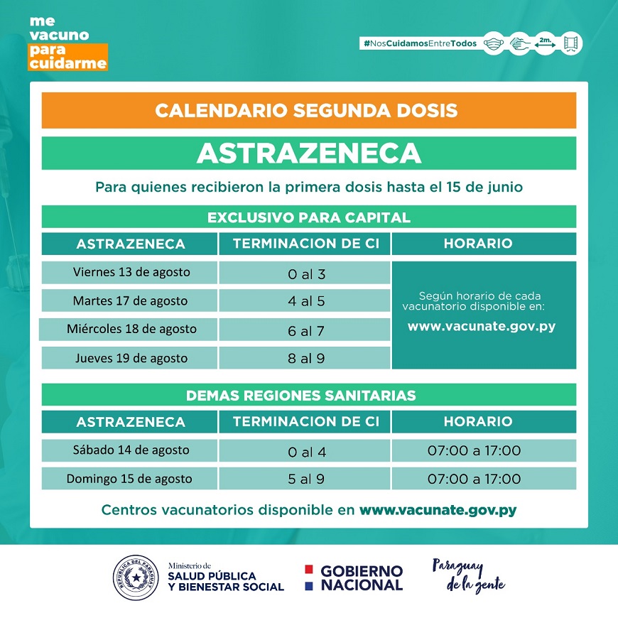 El Plan Nacional de Vacunación contra COVID-19 avanza en la aplicación de segunda dosis. El calendario se realizará por terminación de cédula de identidad, para quienes recibieron primera dosis de AstraZeneca hasta el 15 de junio y de Moderna, para quienes recibieron primera dosis hasta el 16 de julio, tanto para Asunción o Capital, como para los departamentos del país.