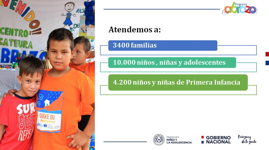 El viceministro de Proyectos del Ministerio de la Niñez y la Adolescencia, Walter Gutiérrez en comunicación con Radio Nacional, resaltó que desde que el MINNA recibió en el 2008 el Programa Abrazo, contaban con 5 centros y 240 beneficiarios y en estos momentos poseen 45 centros en 12 de departamentos del país y se benefician 3400 familias, 500 se sumaron y 300 egresaron por mejorar su calidad de vida. El mismo se fortaleció durante la pandemia de COVID-19 con 20 mil seguimientos familiares, una familia debería contar entre 8 y 9 por año, ese es el objetivo casi un seguimiento por mes.