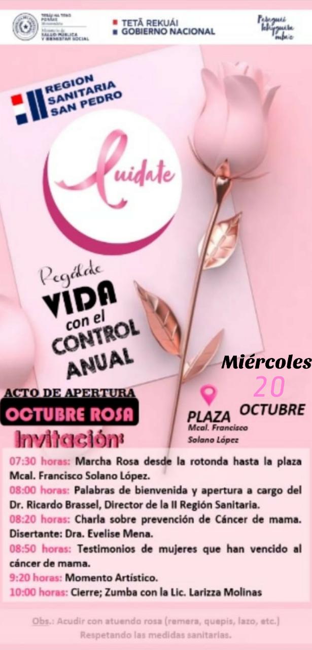 El Departamento de Promoción y Educación de la Segunda Región Sanitaria acompaña con diversas actividades en San Pedro, la campaña se realiza en el marco de este «Mes de la Lucha contra el Cáncer de Mama que se recuerda este martes, al respecto el Dr. Ricardo Brassel, titular de la Segunda Región, anunció que este miércoles se realizará una caminata desde el acceso principal de la ciudad de San Pedro de Ycuamandyyú hasta la plaza Mariscal López, con el evento se recordará la fecha muy importante para sensibilizar a la población con un mensaje clave.
