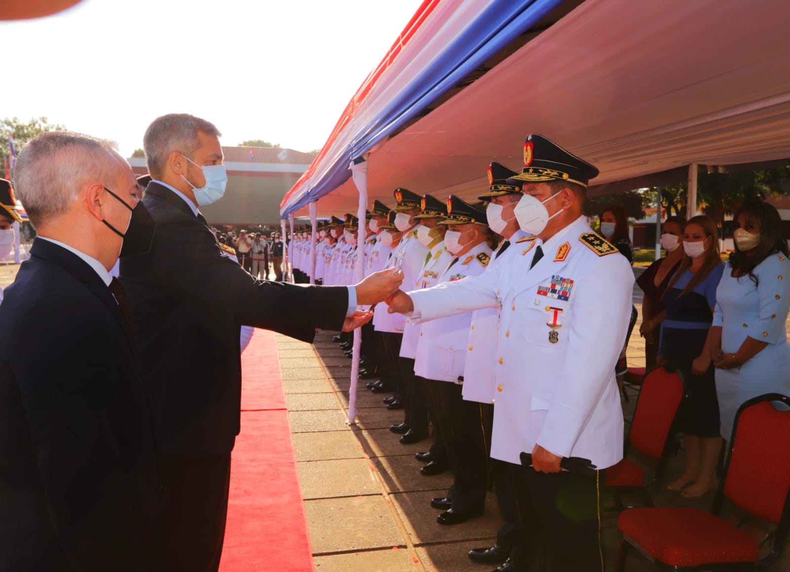 El presidente de la República, Mario Abdo Benítez, entregó bastones de mando y condecoraciones a Comisarios Generales Directores y Comisarios Generales Inspectores de la Policía Nacional, quienes ascendieron en el grado superior, en un acto realizado este martes en la sede de la Academia Nacional de la Policía «General José Eduvigis Díaz», de Luque.