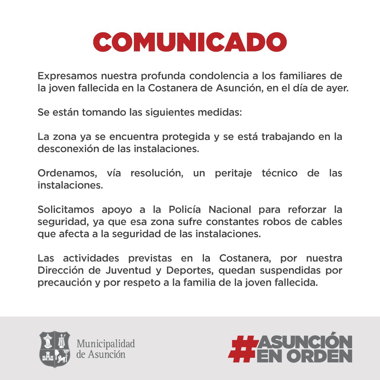 La Municipalidad de Asunción, ordenó un peritaje técnico de las instalaciones y suspendió las actividades programadas, tras el fallecimiento de una joven de 18 años en la Costanera, manifestó este lunes el jefe de Gabinete, Federico Mora.