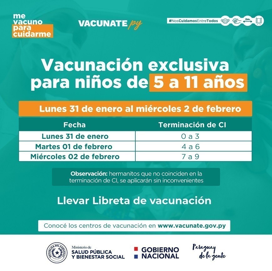 En seguimiento al calendario de vacunación contra Covid-19 y, en el actual contexto de circulación de la variante Ómicron en el país, con un aumento exponencial de los casos, el Ministerio de Salud inicia la vacunación en los niños desde el día lunes 31 de enero al miércoles 02 de febrero con terminación de cédula de identidad. Igualmente, la aplicación de primera, segunda y tercera dosis continuará desde el jueves 03 hasta el sábado, 05 de febrero, en los vacunatorios habilitados de todas las regiones sanitarias del país.