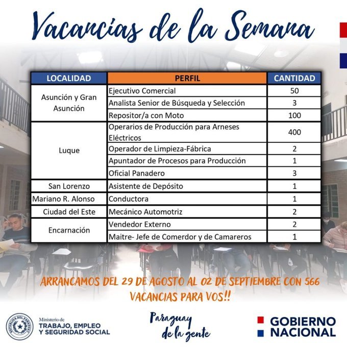 Asunción, Radio Nacional.-El Ministerio de Trabajo, Empleo y Seguridad Social a través de la Vidriera del Empleo, presentó este lunes 566 vacancias laborales, en puestos vigentes del 29 de agosto al 2 de septiembre, informó la ministra Carla Bacigalupo.