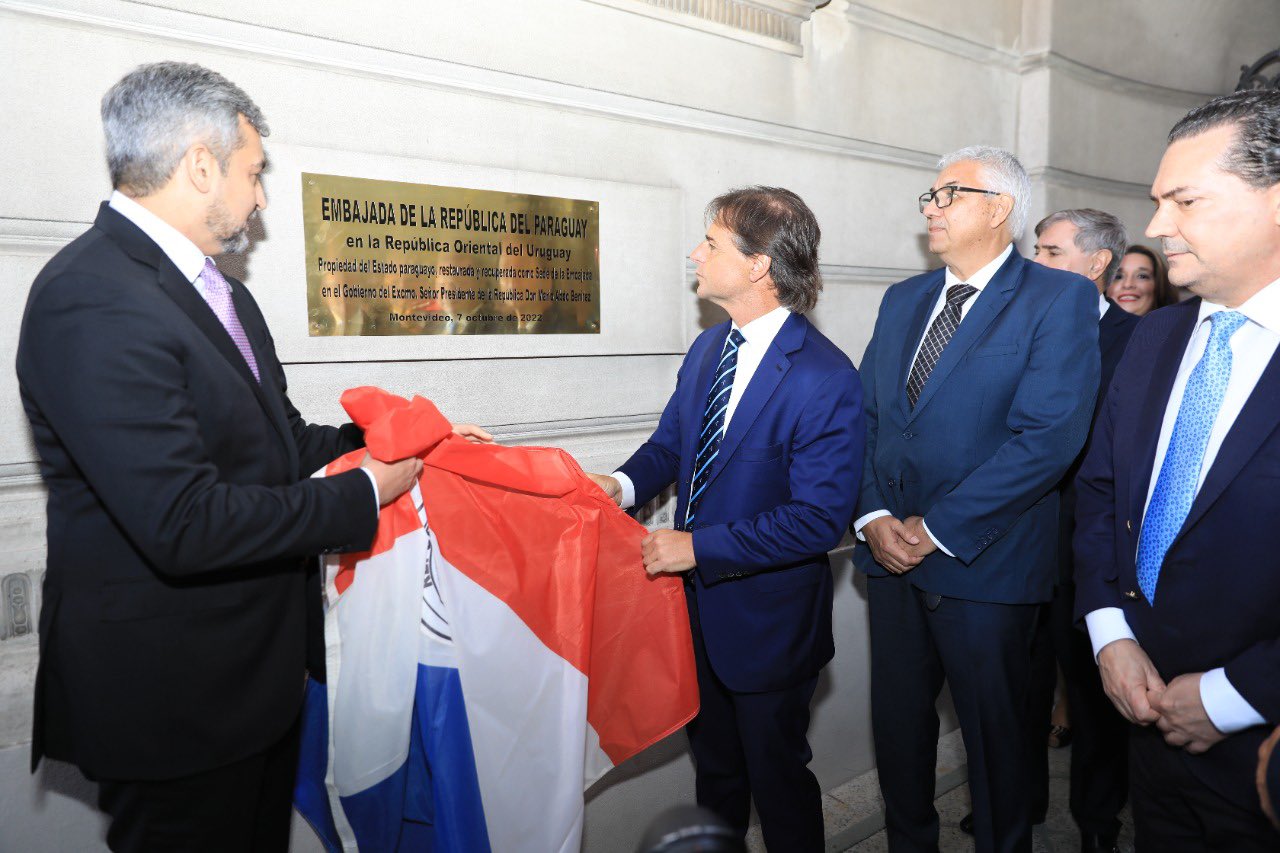 Asunción, Radio Nacional.-Durante una ceremonia, realizada este viernes y que contó con la presencia de los presidentes de Paraguay, Mario Abdo Benítez y de Uruguay, Luis Lacalle Pou, y la primera dama, Silvana Abdo, se procedió a la rehabilitación de la sede de la embajada paraguaya situada en la capital uruguaya. La revalorización del edificio incluyó el revestido de uno de los salones con telares de ñanduti.