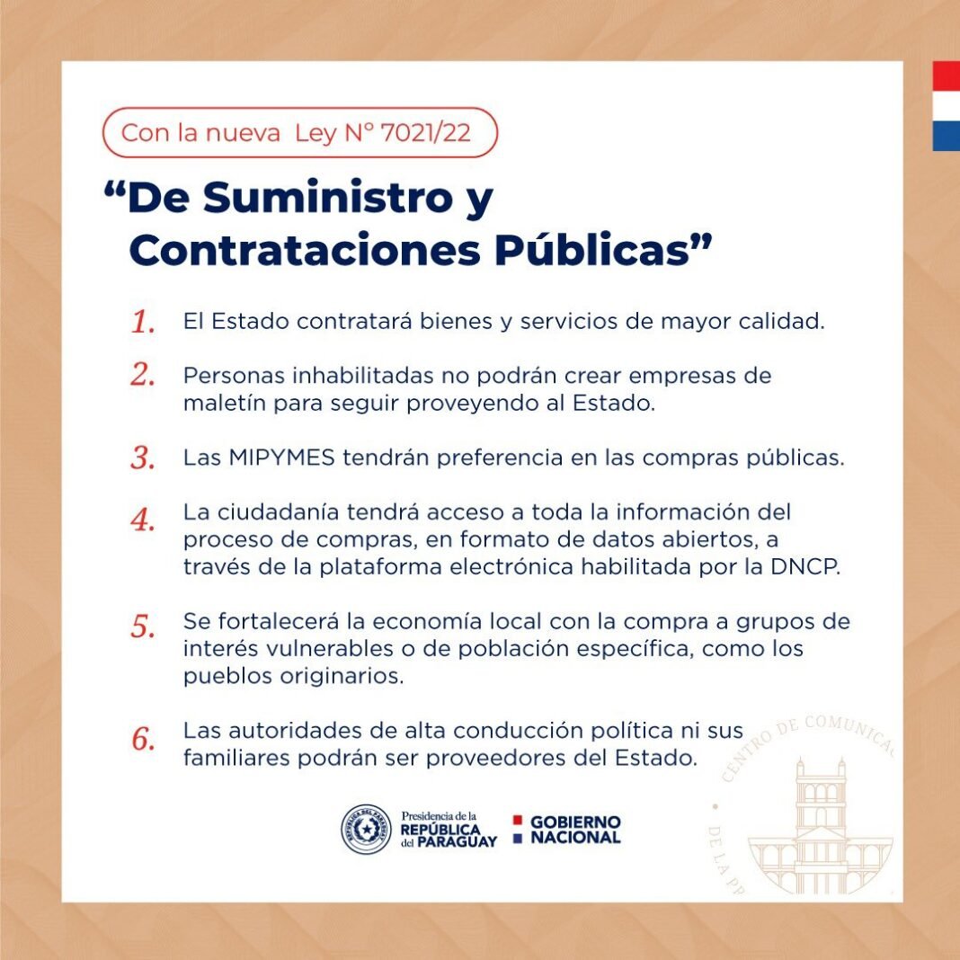 Asunción, Radio Nacional.-A fin de cambiar el paradigma de contratación con el Estado, el presidente de la República, Mario Abdo Benítez, promulgó este viernes, la ley de Suministro y Contrataciones Públicas.