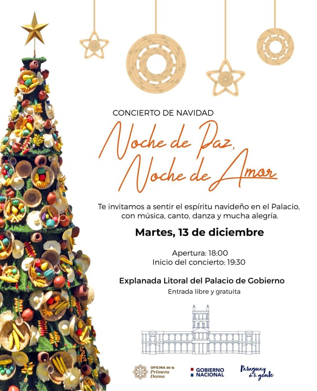 Asunción, Radio Nacional.-El Gran Concierto de Navidad en el Palacio de Gobierno, se realizará este martes 13 de diciembre desde las 18:00 horas en la Explanada litoral. Este evento contará con la participación de músicos, cantantes, bailarines y otros artistas paraguayos. La entrada es libre y gratuita.