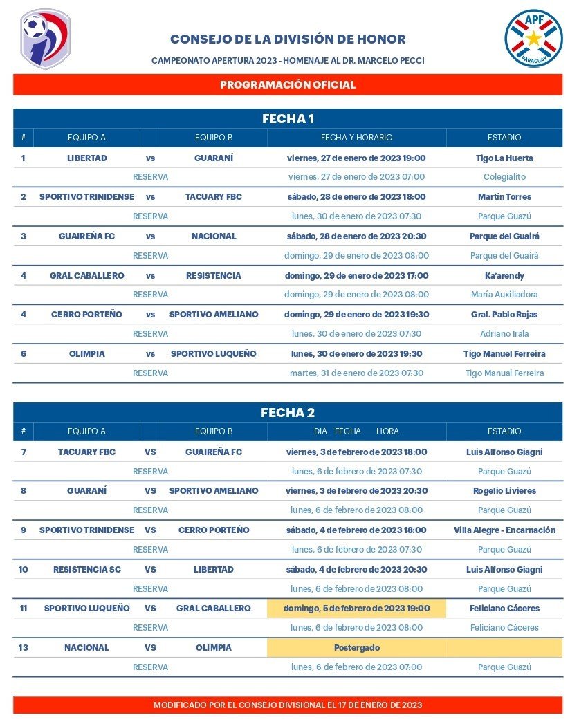 Asunción, Radio Nacional.-El encuentro entre Libertad y Guaraní, dará el inicio del torneo Apertura 2023 “Homenaje al Dr. Marcelo Pecci”, informó el Consejo de la División de Honor de la Asociación Paraguaya de Fútbol.