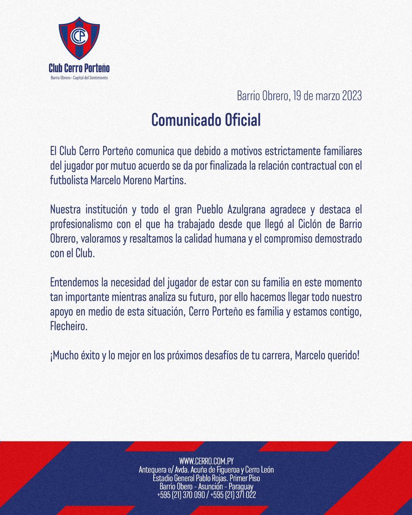 Asunción, Radio Nacional.-La relación contractual entre Cerro Porteño y el futbolista boliviano, Marcelo Moreno Martins, se da por finalizada, anunció este lunes la institución de barrio Obrero, a través de un comunicado, publicado en las redes sociales del club.