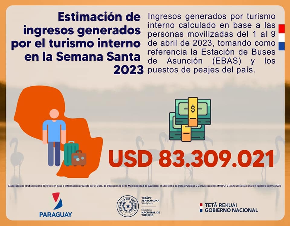 Asunción, Radio Nacional.-Los ingresos generados por el movimiento del turismo interno, durante la Semana Santa,  alcanzaron una cifra estimada de USD 83.309.021, superior a la registrada en 2022, con una amplia y dinámica movilización de personas y vehículos en todo el territorio nacional.