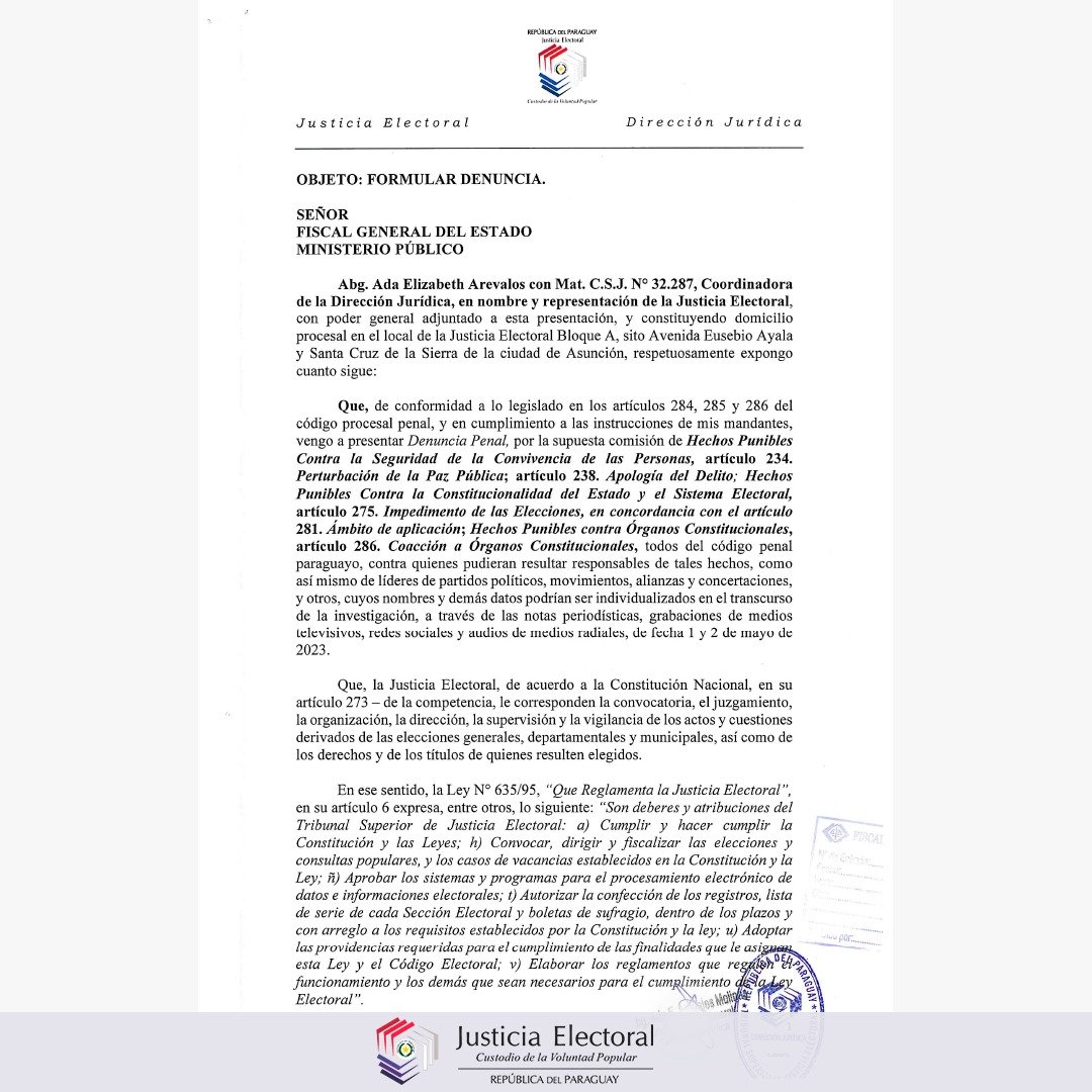 Por los hechos punibles contra la seguridad de la convivencia de las personas, el Tribunal Superior de Justicia Electoral, presentó este martes una denuncia penal ante el Ministerio Público.