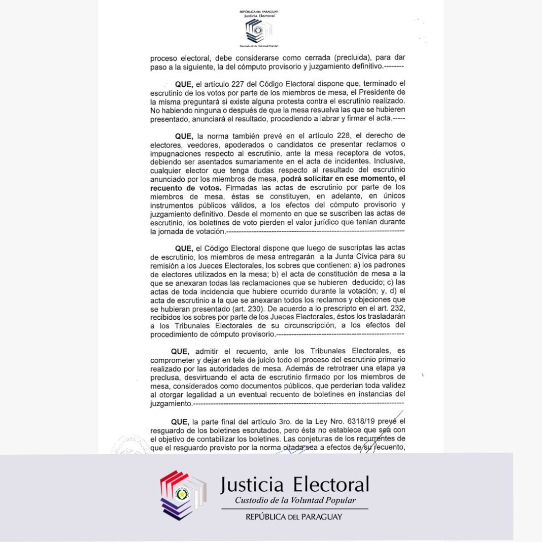 El Tribunal Superior de Justicia Electoral, no hace lugar a los pedidos de apertura del sobre número 4 de las elecciones nacionales, informó este jueves la institución.