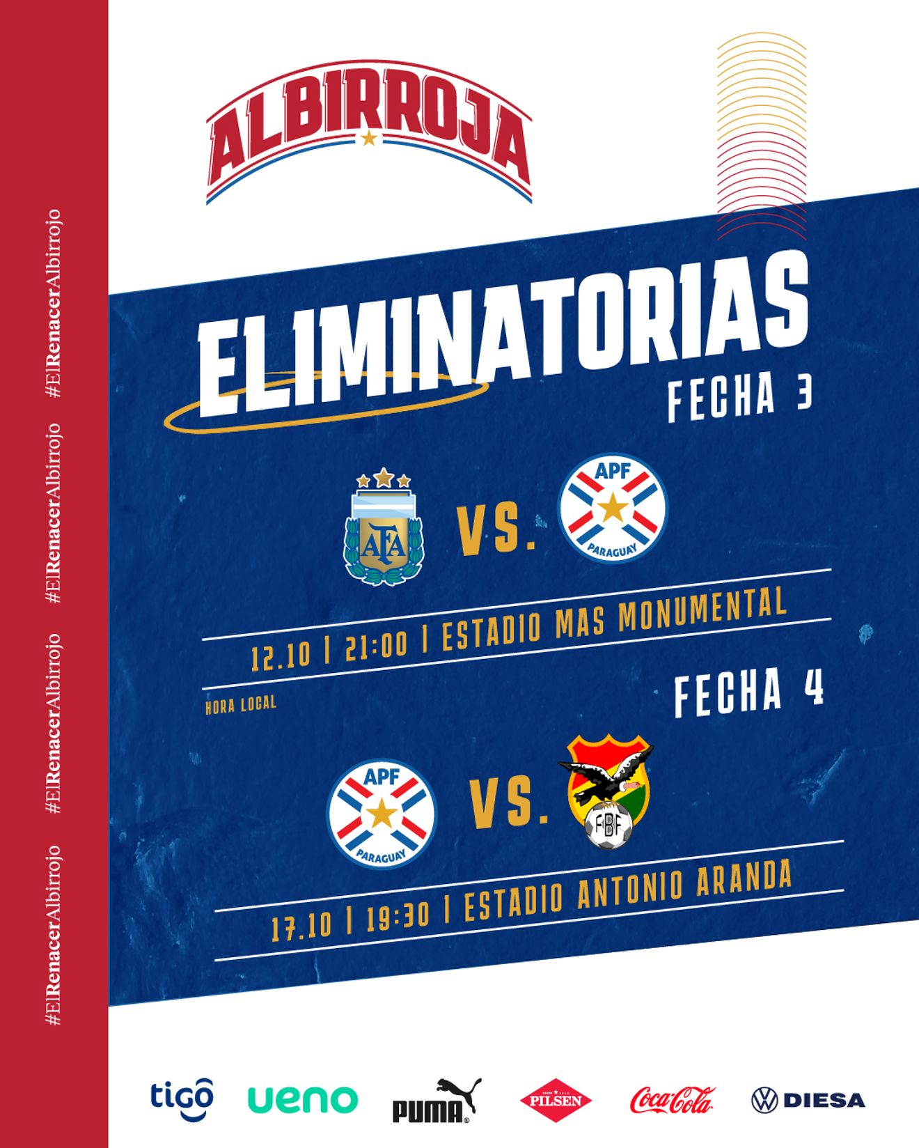 Por la tercera jornada del clasificatorio al Mundial de Fútbol 2026, la Selección Paraguaya de Fútbol, visitará el jueves 12 de octubre a la Argentina para disputar con la albiceleste en el estadio Monumental a las 21:00 hora local.