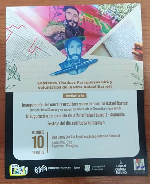 En conmemoración al Día del Poeta, el Ministerio de Educación y Ciencias (MEC), invita a la inauguración de la Ruta Rafael Barrett – Asunción y del mural Rafael Barrett, este martes 10 de octubre a las 10:00. La entrada es libre y gratuita, para todo público.