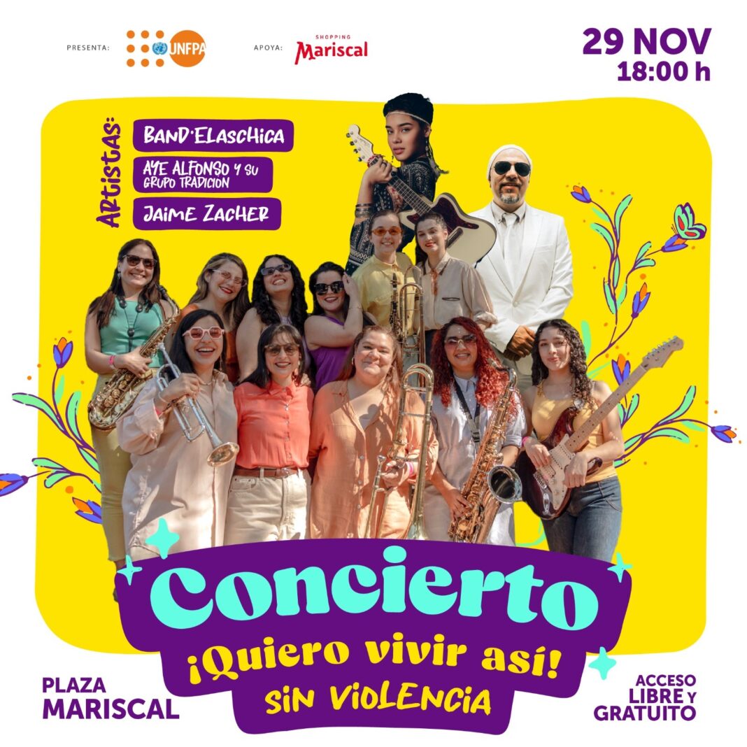Los artistas nacionales Aye Alfonso, Band’Elaschica y Jaime Zacher serán protagonistas del concierto de cierre de la campaña Quiero Vivir Así Sin Violencia del Fondo de Población de las Naciones Unidas, UNFPA.