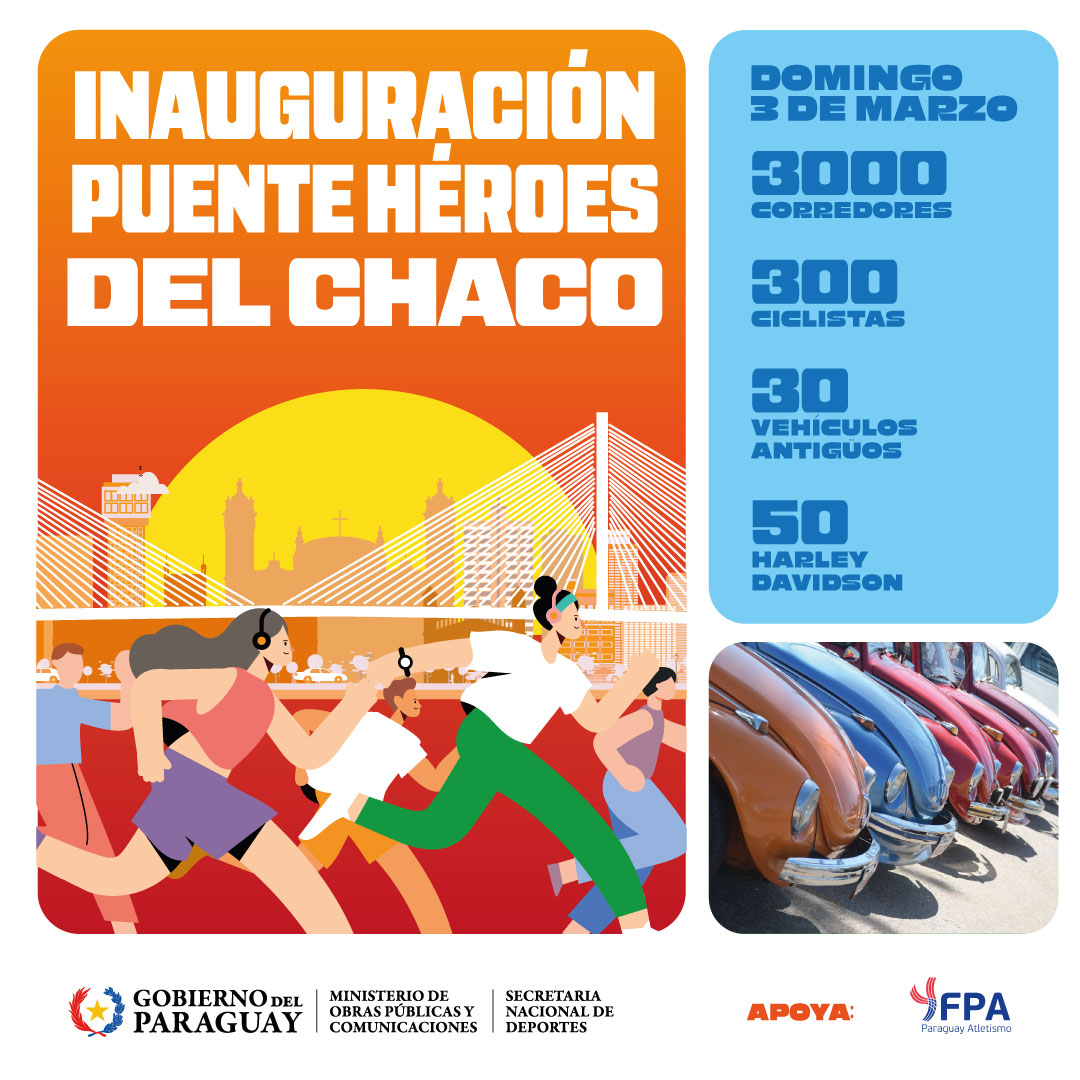 Para la correcaminata del domingo 3 de marzo, que marcará el inicio de la jornada de inauguración del Puente Héroes del Chaco, ya se inscribieron más de 3.000 participantes y se espera todavía que se suman más interesados. La actividad arrancará a las 07:30 horas, en un recorrido de 5 kilómetros, ida y vuelta, sobre el nuevo puente.