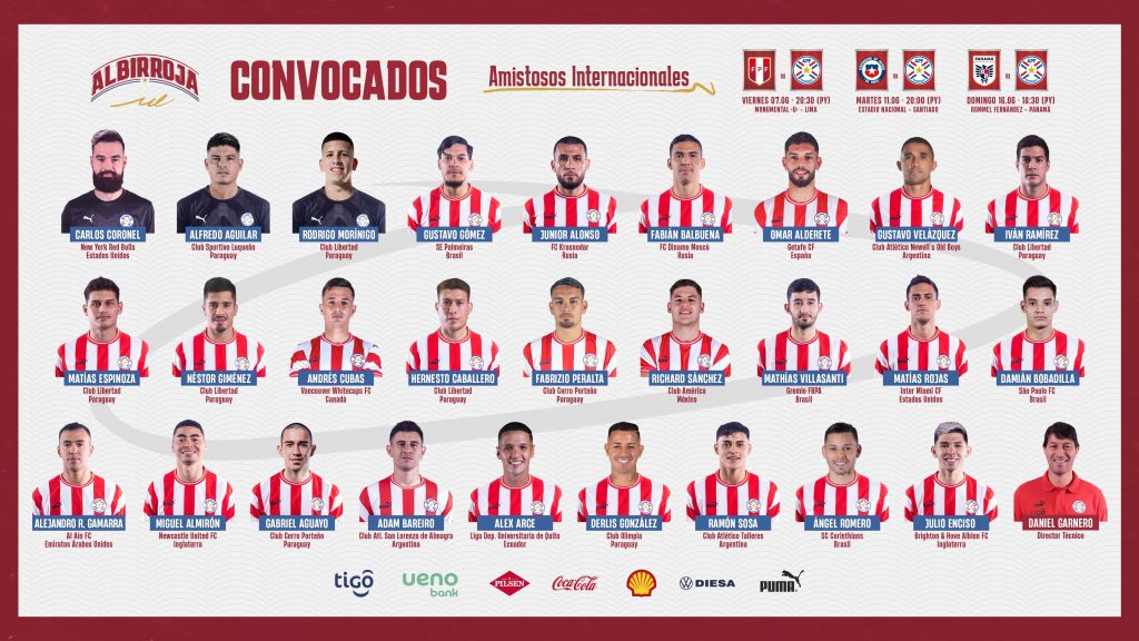 La lista continúa con Matías Espinoza (Libertad), Néstor Giménez (Libertad), Andrés Cubas (Vancouver, Canadá), Hernesto Caballero (Libertad), Fabrizio Peralta (Cerro Porteño), Richard Sánchez (América, México), Mathías Villasanti (Gremio, Brasil), Matías ROjas (Inter Miami, EE.UU.) y Damián Bobadilla (Sao Paulo, Brasil).
