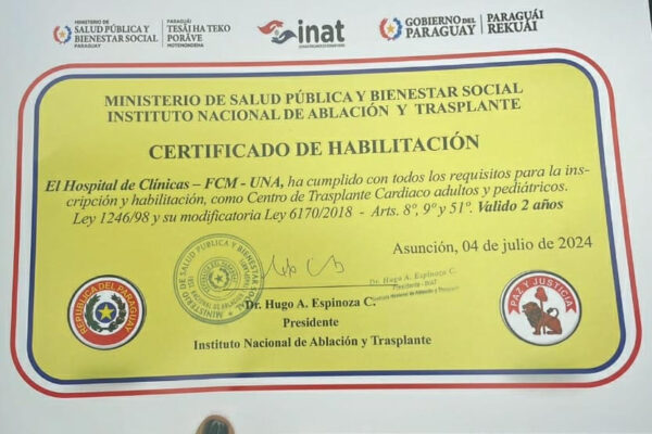 El jefe de cardiocirugía del Hospital de Clínicas, doctor Jorge Rotela, anunció este martes, que recibieron la certificación del INAT para la realización del trasplante cardiaco.