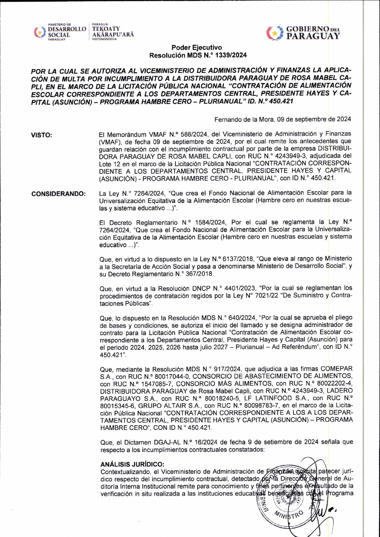 Según la resolución MDS 1.339/2024, el ministro Tadeo Rojas autorizó al Viceministerio de Administración y Finanzas, la aplicación de una multa por valor de G. 1.720.498.903 (guaraníes mil setecientos veinte millones cuatrocientos noventa y ocho mil novecientos tres).