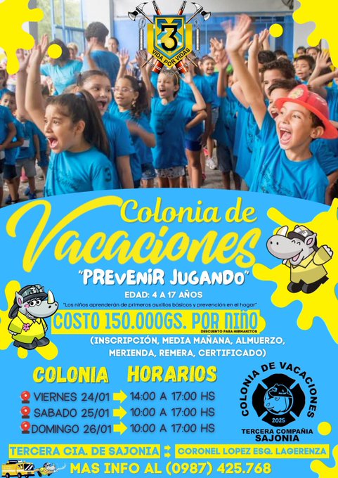 Los Bomberos de la Tercera Compañía Sajonia, invitan a la Colonia de Vacaciones para niños y adolescentes a realizarse del 24 al 26 de enero, informó este jueves Chiara Salza.