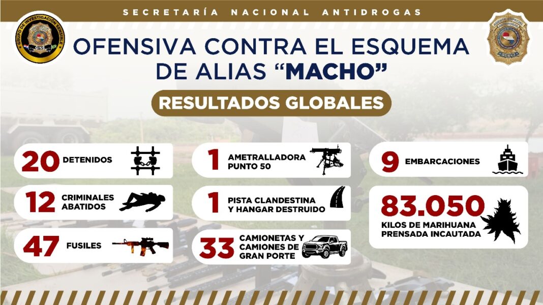 La Secretaría Nacional Antidrogas, destacó sobre la ofensiva contra el esquema de alias «Macho» y los resultados globales del operativo.
