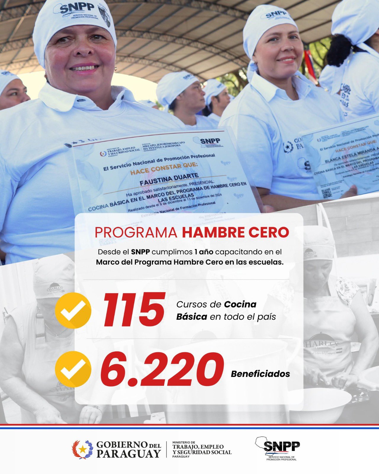 En el marco del primer año del programa Hambre Cero, el Servicio Nacional de Promoción Profesional, capacitó a cocineras y manipuladores de alimentos en todo el país, destacó este martes el director general del SNPP, José Cogliolo.