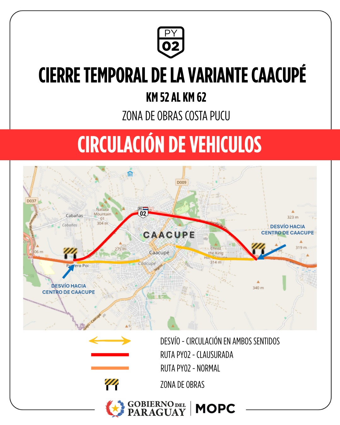 El Ministerio de Obras Públicas y Comunicaciones, dispuso el cierre temporal de la variante de Caacupé, del kilómetro 52 al 62, por montaje de vigas en el paso superior Costa Pucú, explicó este lunes la coordinadora de Proyectos en Explotación, Rocío Calmejane.