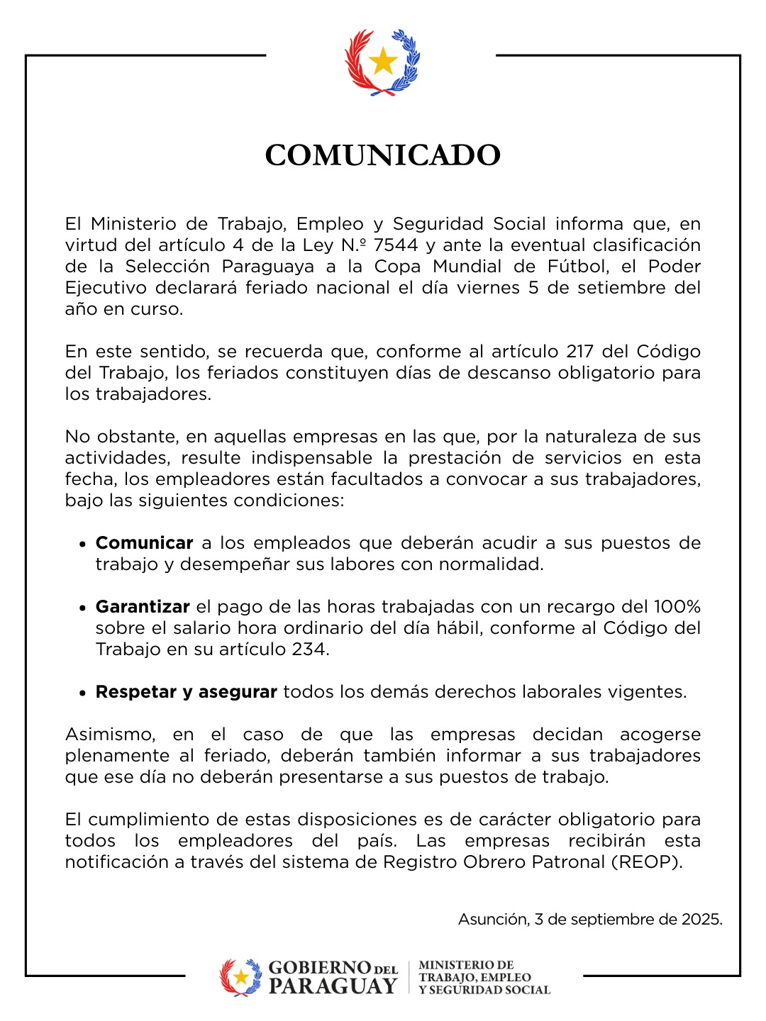 El Ministerio de Trabajo, Empleo y Seguridad Social informa que, en virtud del artículo 4 de la Ley N.º 7544 y ante la eventual clasificación de la Selección Paraguaya a la Copa Mundial de Fútbol, el Poder Ejecutivo declarará feriado nacional el día viernes 05 de setiembre del año en curso.