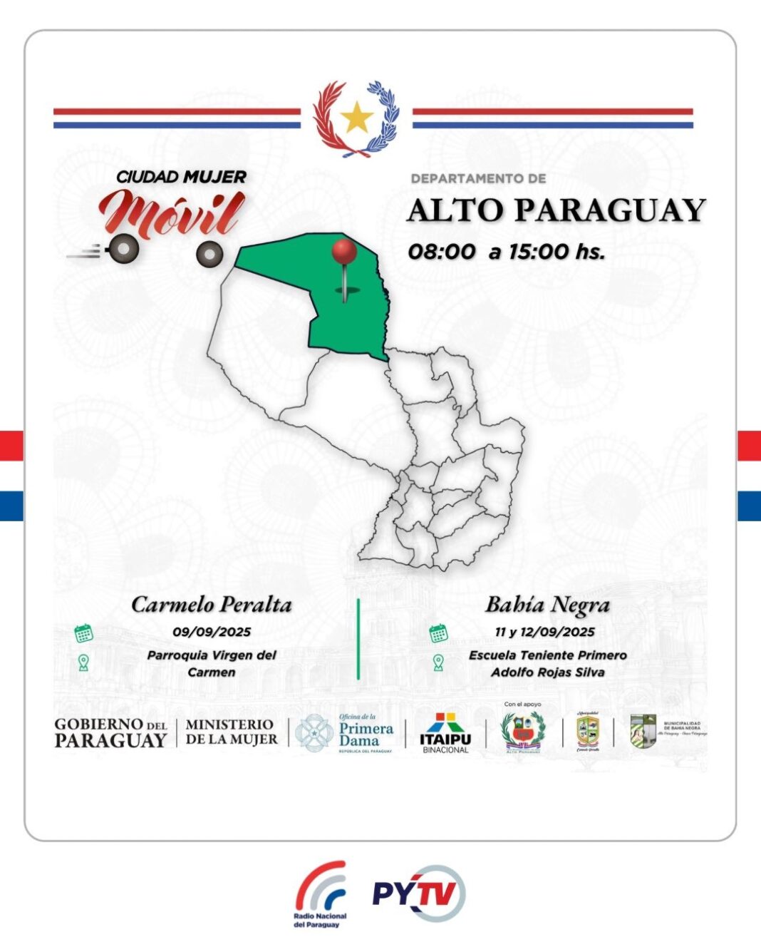 Por otro lado, mencionó que los los móviles se trasladarán a Bahía Negra, donde estarán presente los días jueves 11 y viernes 12 de septiembre en la Escuela Teniente Primero Adolfo Rojas Silva, de 08:00 a 15:00 hs.