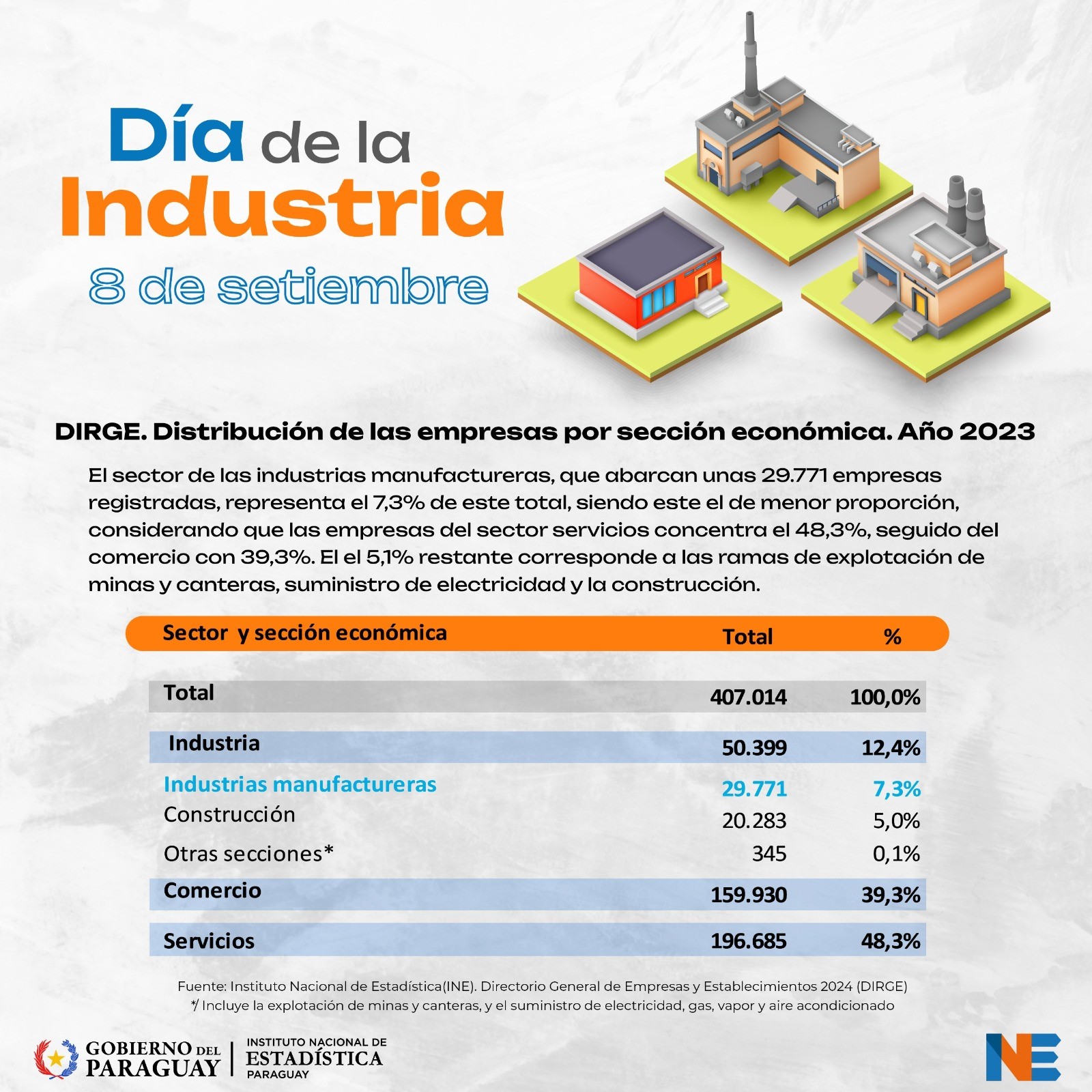 Finalmente, recordó que en el Dia de la Industria Nacional, que se celebra en Paraguay cada 8 de septiembre, el INE relaciona a la cantidad de empresas registradas que se dedican a la actividad manufacturera.